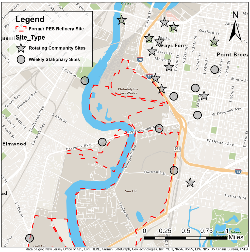 Through this co-design process, we found that community members were concerned about pollution from traffic, and pollution coming from the former Philadelphia Energy Solutions refinery site, which is now in the process of getting re-developed into a warehousing and life sciences district. We chose monitoring sites based on trying to find out the contribution of those sources to air pollution in our study area.